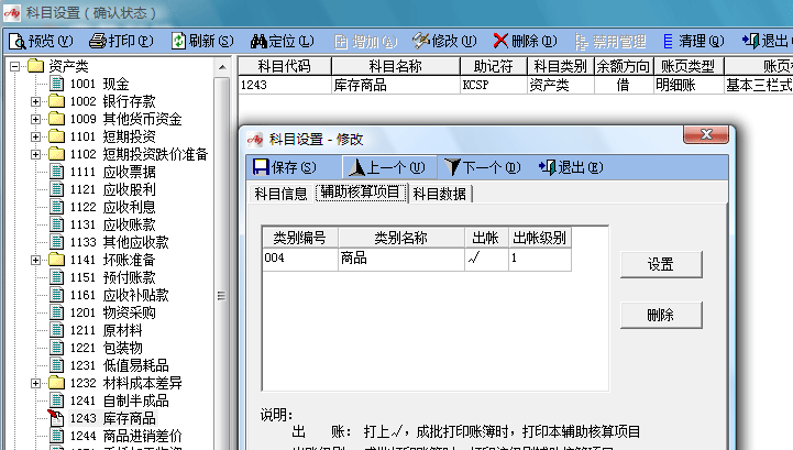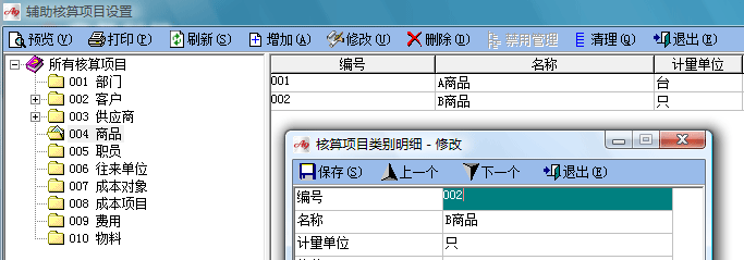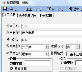 在核算項目“商品”下面設商品明細。并在每個明細商品中,輸入相應的計量單位。如下圖: