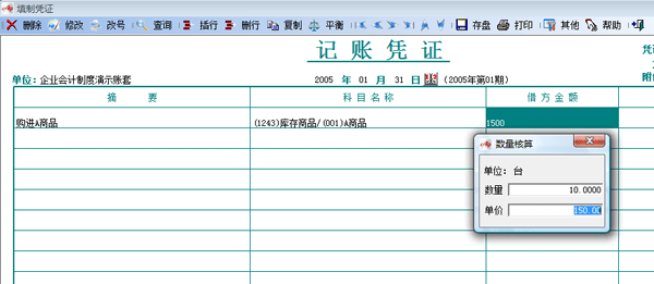 在日常填制憑證時,當輸入“庫存商品”,“主營業務收入”科目的金額后,會自動跳出數量、單價窗口。如下圖: