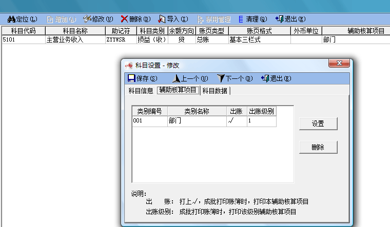 1,在科目“主營業務收入”,掛接輔助核算項目“部門”,如下圖: