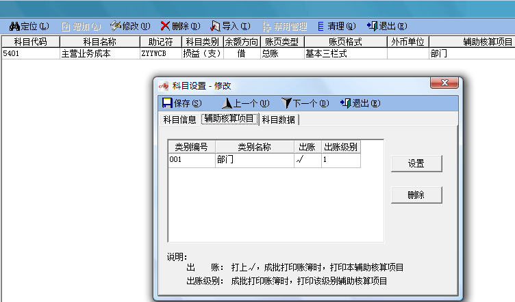 2,在科目“主營業務成本”,掛接輔助核算項目“部門”,如下圖: