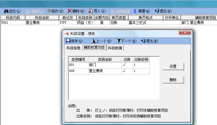 3,在科目“營業費用”,掛接輔助核算項目“部門”、“營業費用”,如下圖:
