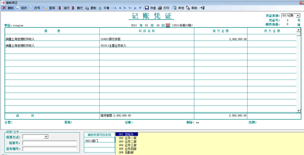 在日常填制憑證時,當輸入“主營業務收入”、“主營業務成本”、“營業費用”等科目時,軟件會自動跳出想對應的核算部門,供輸入,然后再輸入金額。如下圖: