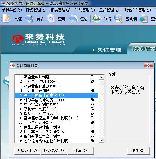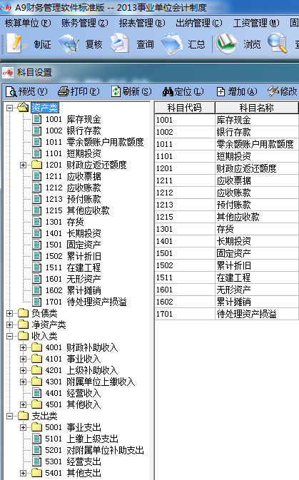 為方便廣大用戶能及時用上最新的事業單位會計制度,A9財務管理軟件于2012年底,將該制度的科目,報表設計進軟件中,如圖: